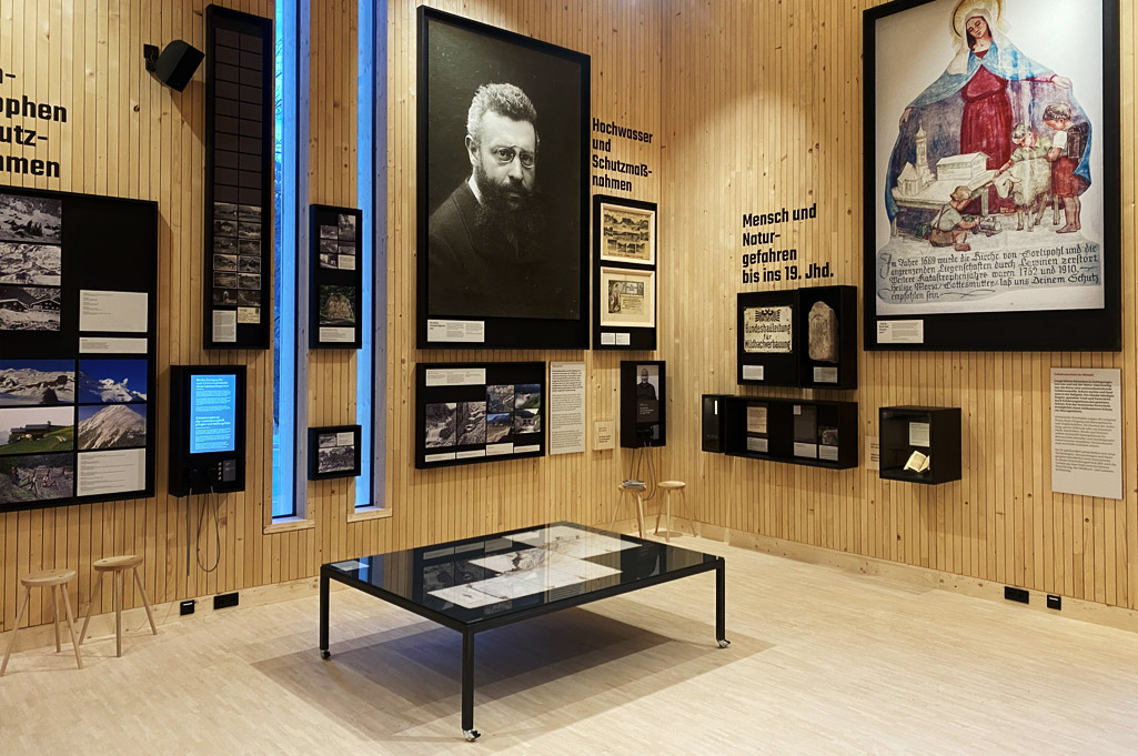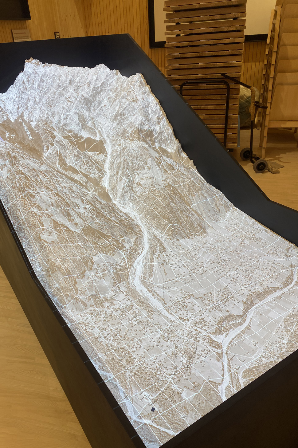 Ein zentrales Highlight des Aktionsraums ist die 3D Reliefprojektion. Auf einem physischen Geländemodell werden dynamische Inhalte projiziert, die Naturereignisse wie Lawinen und Hochwasser simulieren. Dabei werden Gefahrenzonen sichtbar gemacht und Veränderungen der Topografie über Jahrzehnte hinweg eindrucksvoll dargestellt.