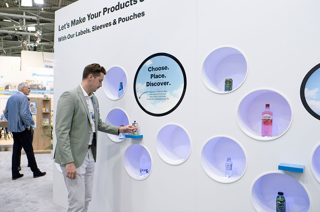 Ein weiterer Kernbaustein war eine interaktive Produktwand, die sich formal am Corporate Design von CCL Label orientiert und Produkte per RFID erkennt. Auf runden Screens erscheinen dazu passende Inhalte und Detailinformationen, wodurch haptische Produktinszenierung und digitale Wissensvermittlung zu einem publikumswirksamen Erlebnis verschmelzen.